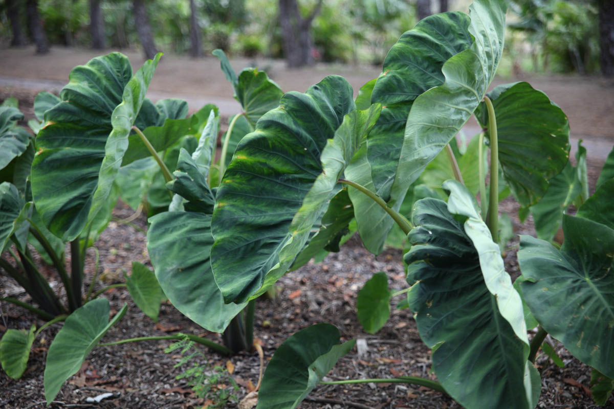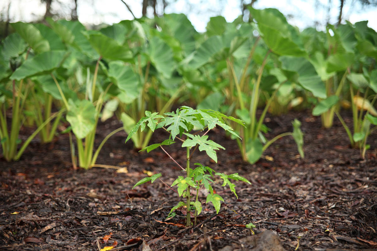 Papaya (there are about 10 of these small ones) in the foreground. Taro in the background.