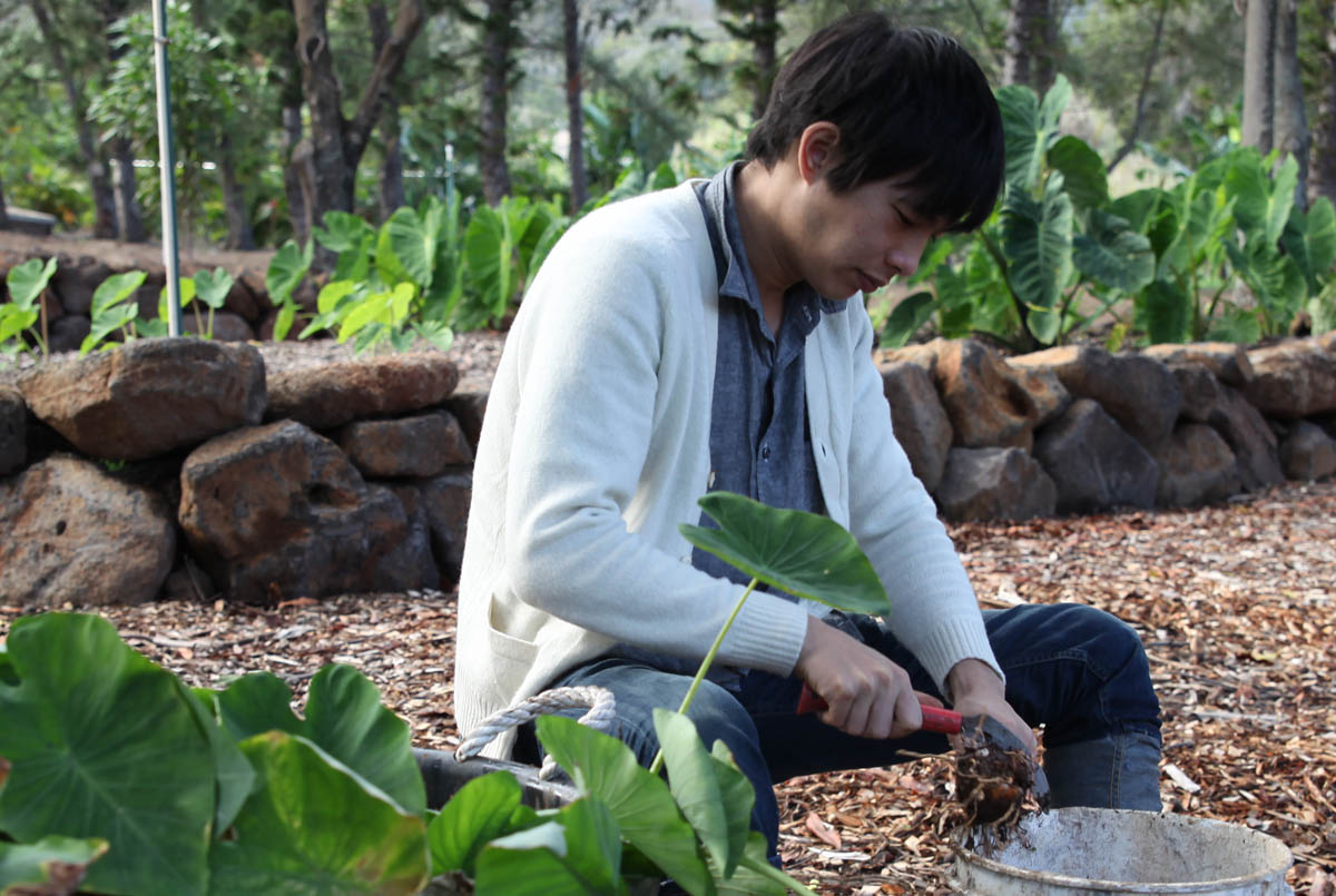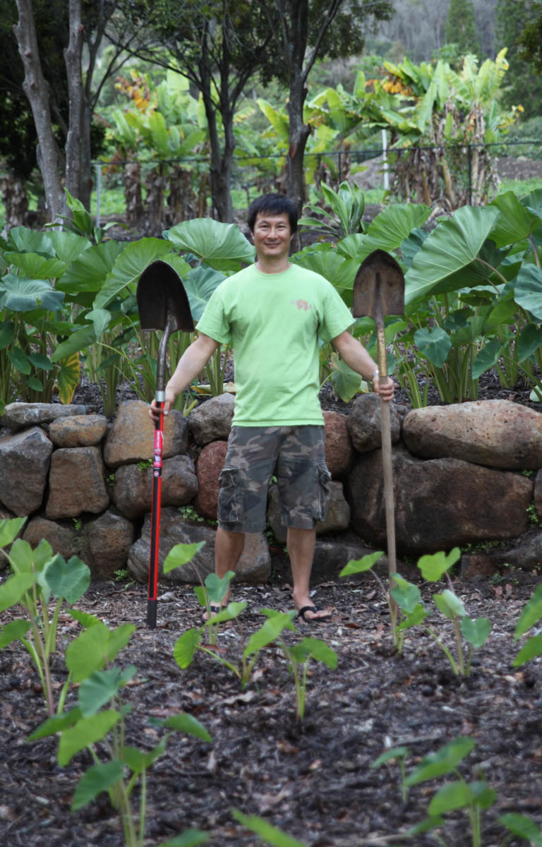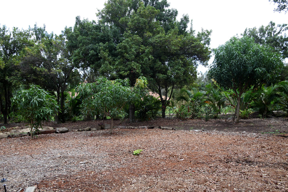 Sweet potatoes, mango trees, and macadamia trees from fore to background. Sweet potato and mango still immature. Macadamia nuts are mature and producing lots of nuts.
