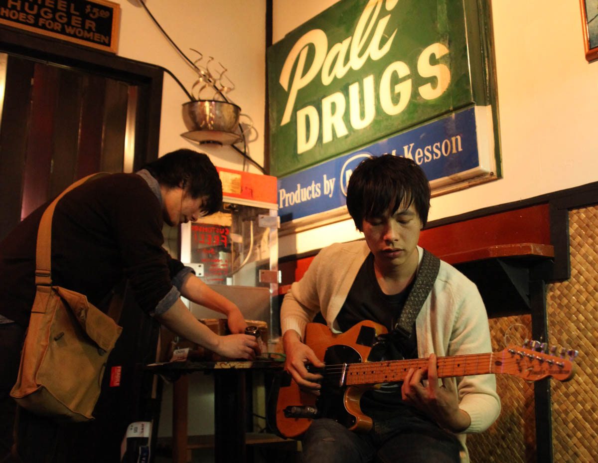 Dustin checks the sound at Hank’s Café, a dive on Nuuanu St just off Hotel St in Honolulu while Isaac sets audio levels for recording. Dustin played a great set — symphonic in structure, one theme blending into another.
