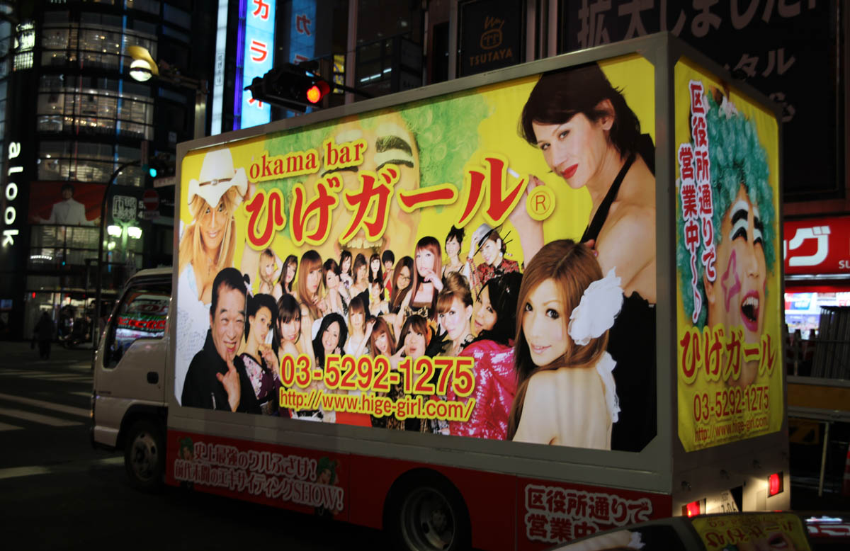 On the street in Shinjuku, an ad trailer for “Hige Girl,” literally, “bearded girl” — a gathering place for “okama.” Which means, of course: “gay.”