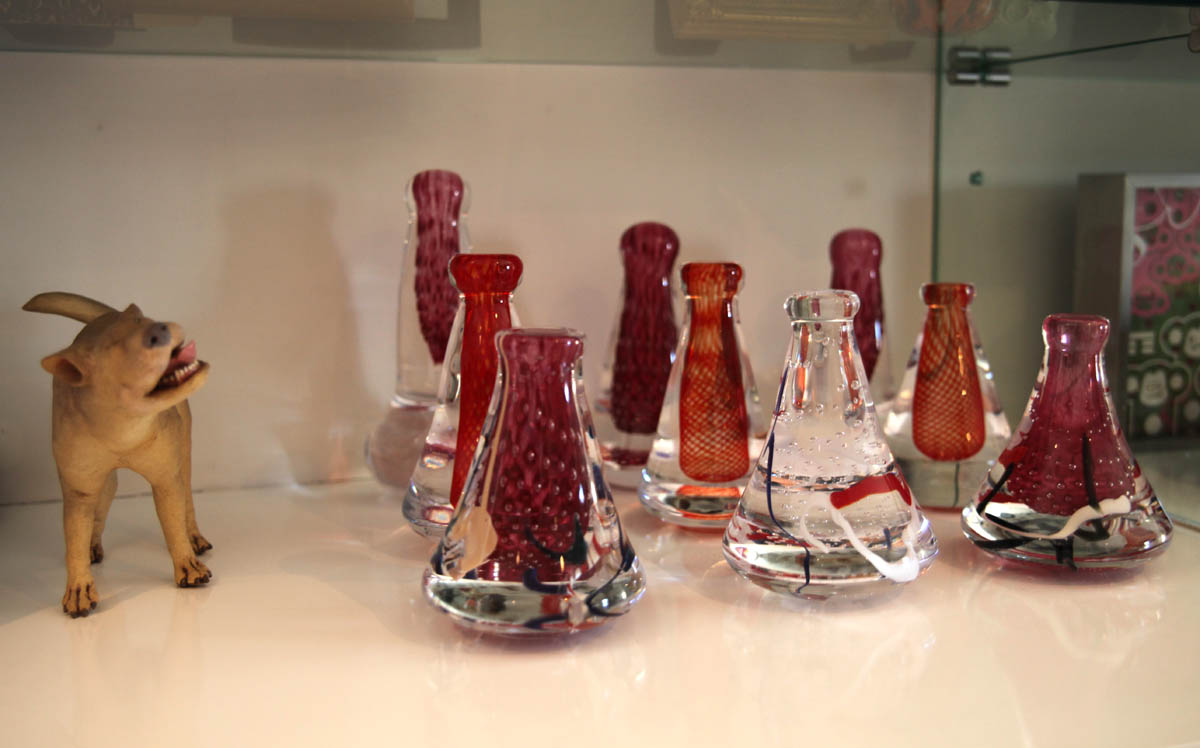 Glass poi pounders and a poi dog (ceramic sculpture by Esther Shimazu). And yes, man can live on poi alone. With a little dog…