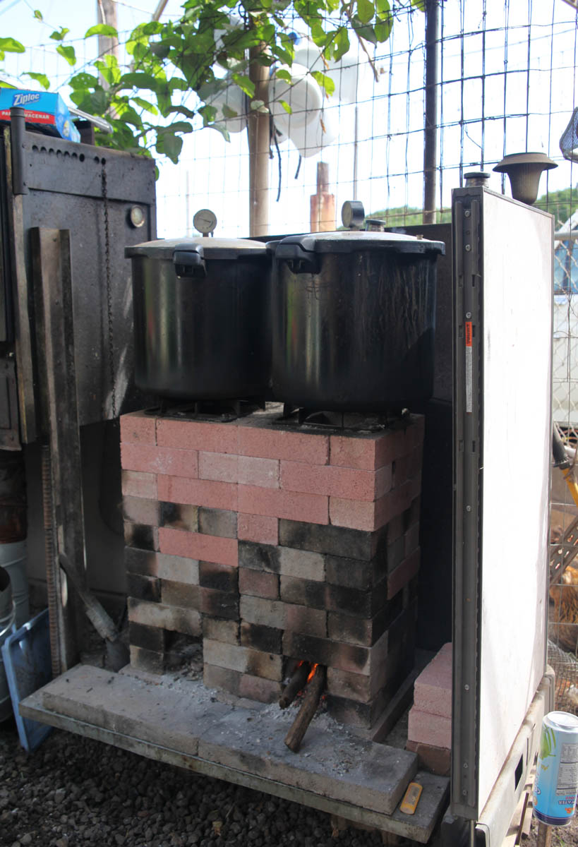 Hanalei has a postage stamp of a property in Wailuku, but he has maxed it out for sustainability. These rocket stoves are pressure-cooking laulau (pork, fish, chicken, taro, etc wrapped in taro leaves) and taro. Because his wife and children are extra-sensitive to calcium oxalate crystals, they pressure cook for 3 hours, which would use a lot of electricity or gas. Definitely helps his utility bills.