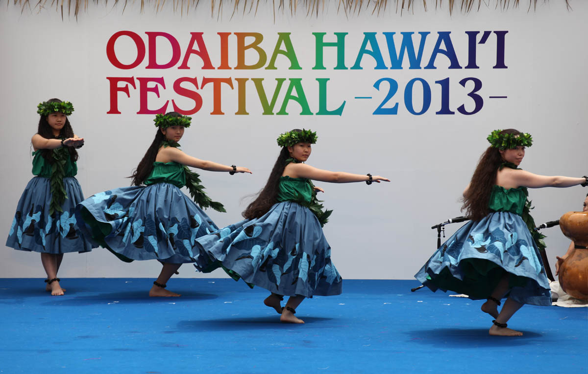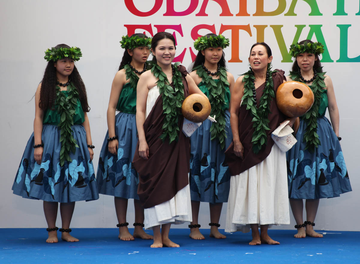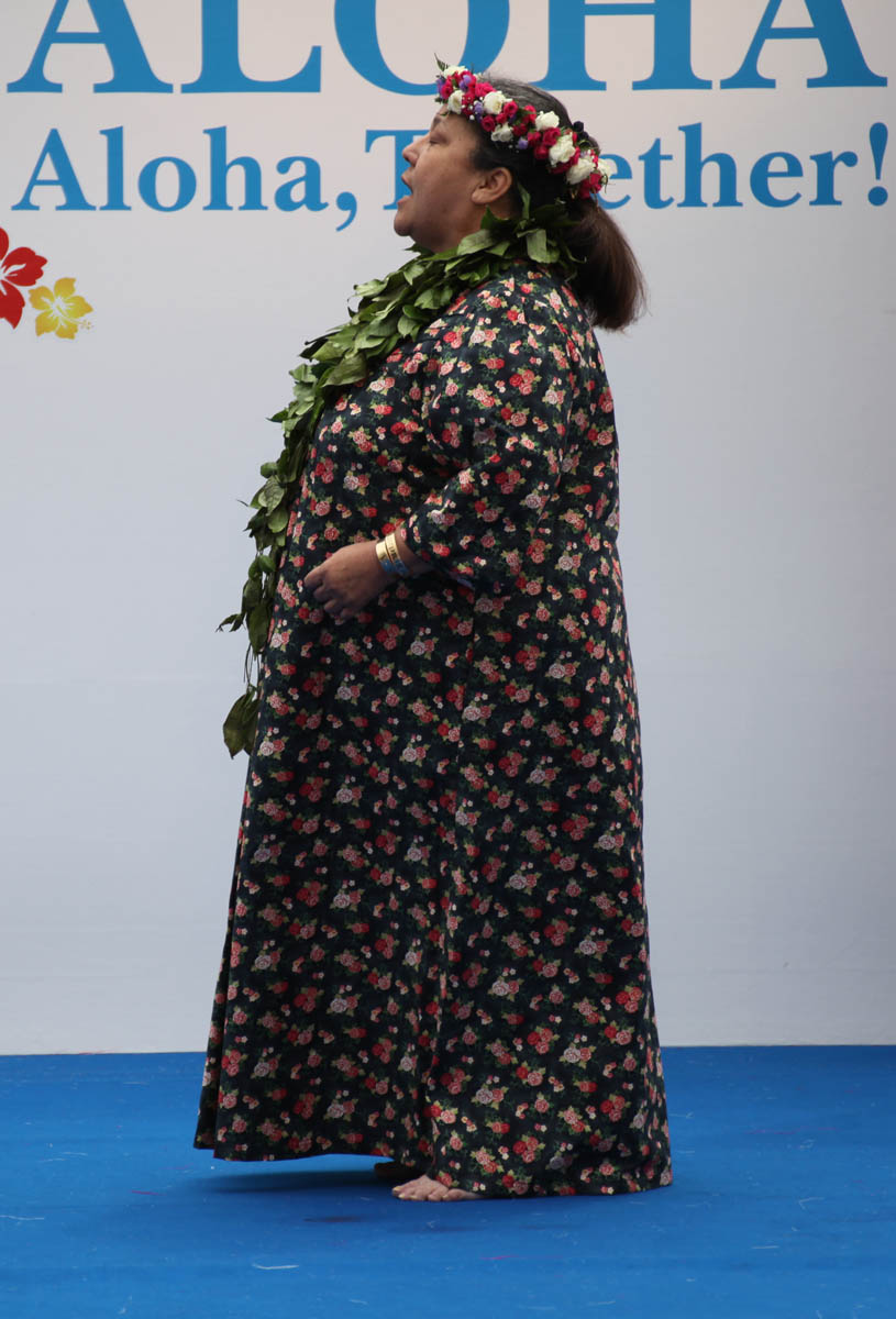 Kumu Hokulani Holt chanted to open the performance at VenusFort, Odaiba, Tokyo.