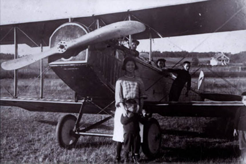 Malcolm’s grandmother, Edith Lee, in front of a training plane at the the Victoria Chinese Aviation School. Edith’s brother-in-law, Chan Dun, founded this school for pilots fighting to overthrow the Qing Dynasty around 1920 in Victoria, BC, Canada.