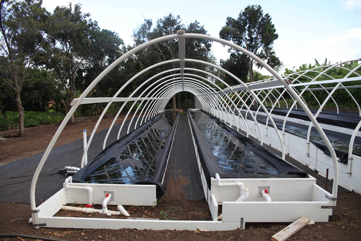 Not the birth canal, but two of the aquaponics troughs with the completed netting structure.