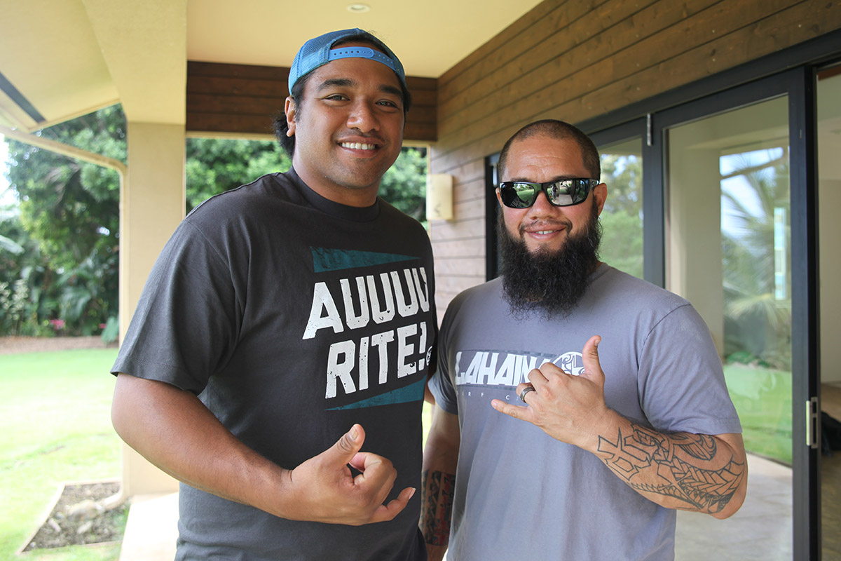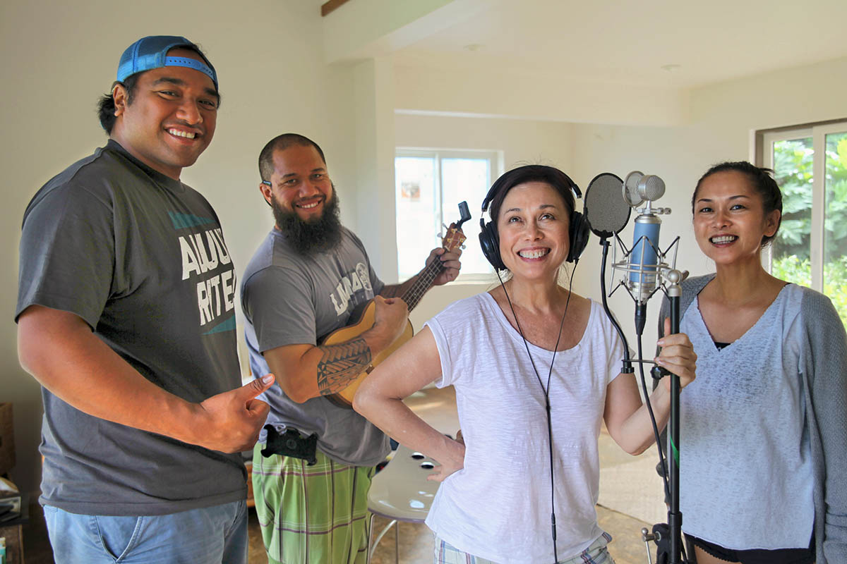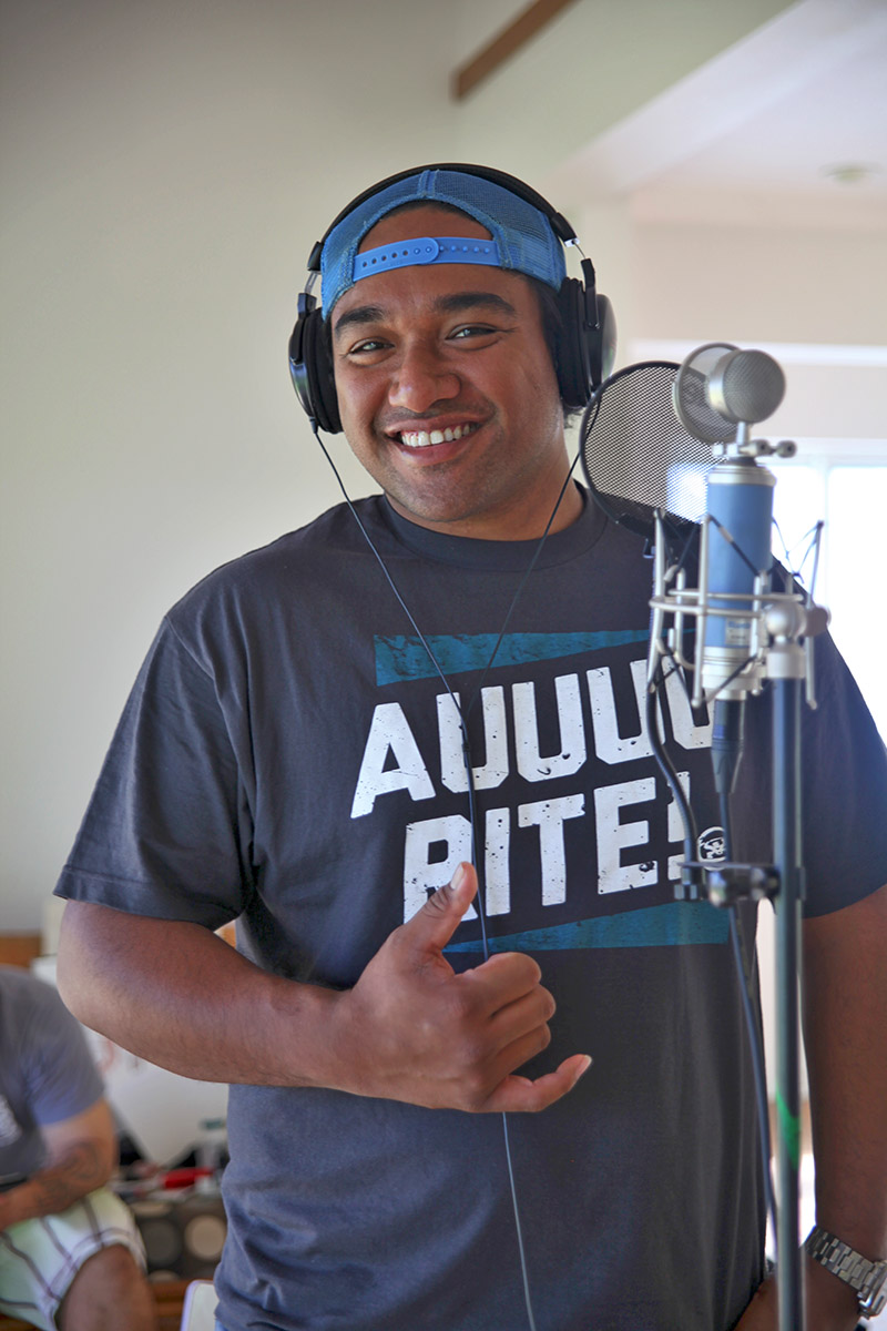 Recording music with Kimo Brehm (right) on lead vocal, guitar, bass, ukulele and Kaniala Masoe (left) with the high harmony at Anekona Studios at the Koop.