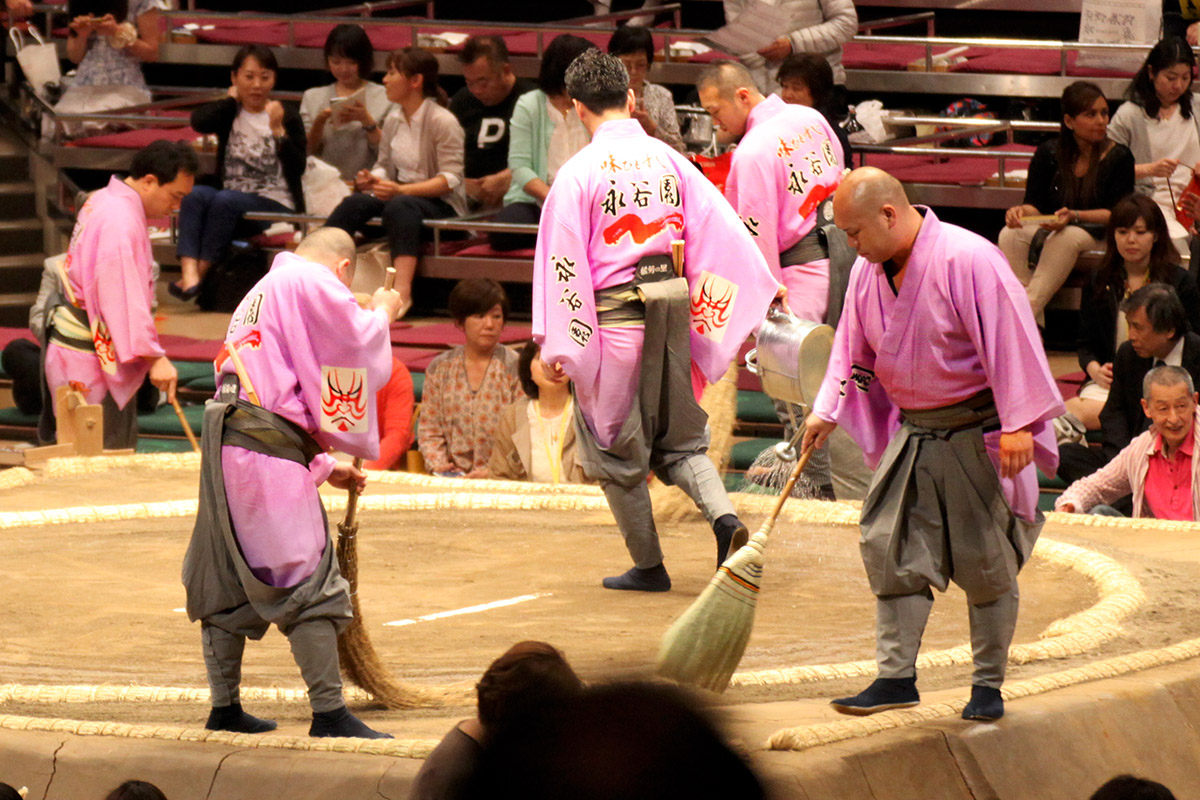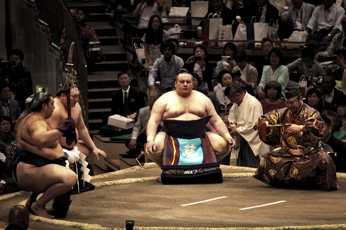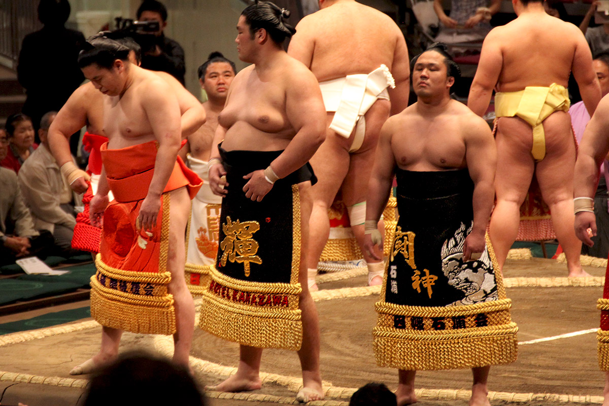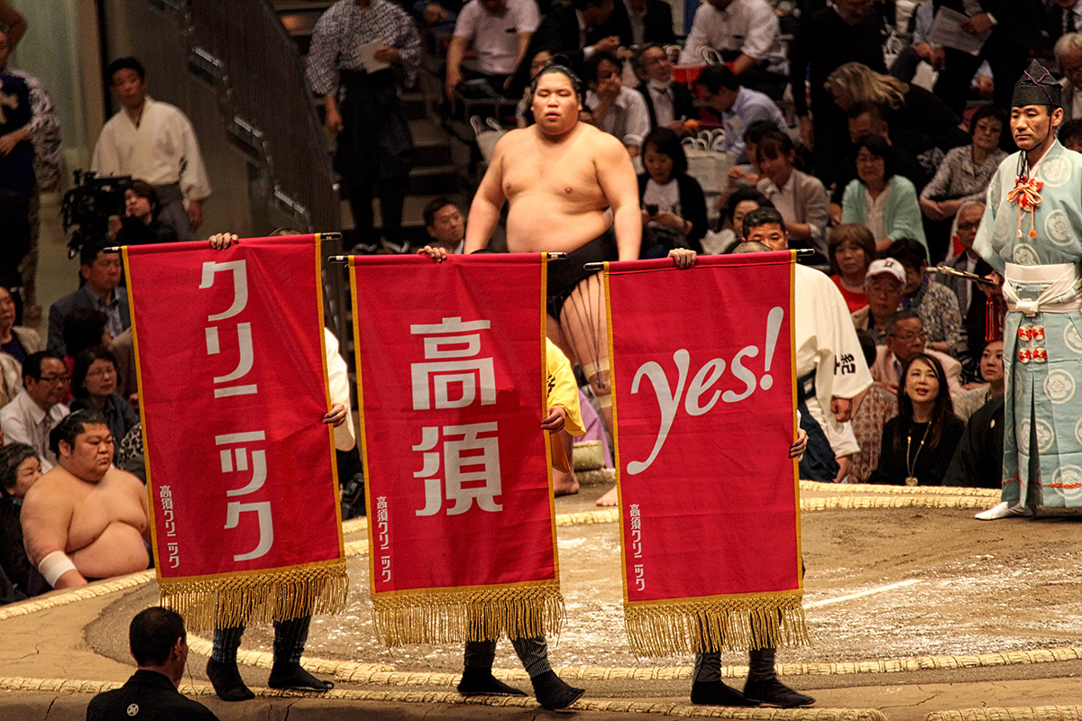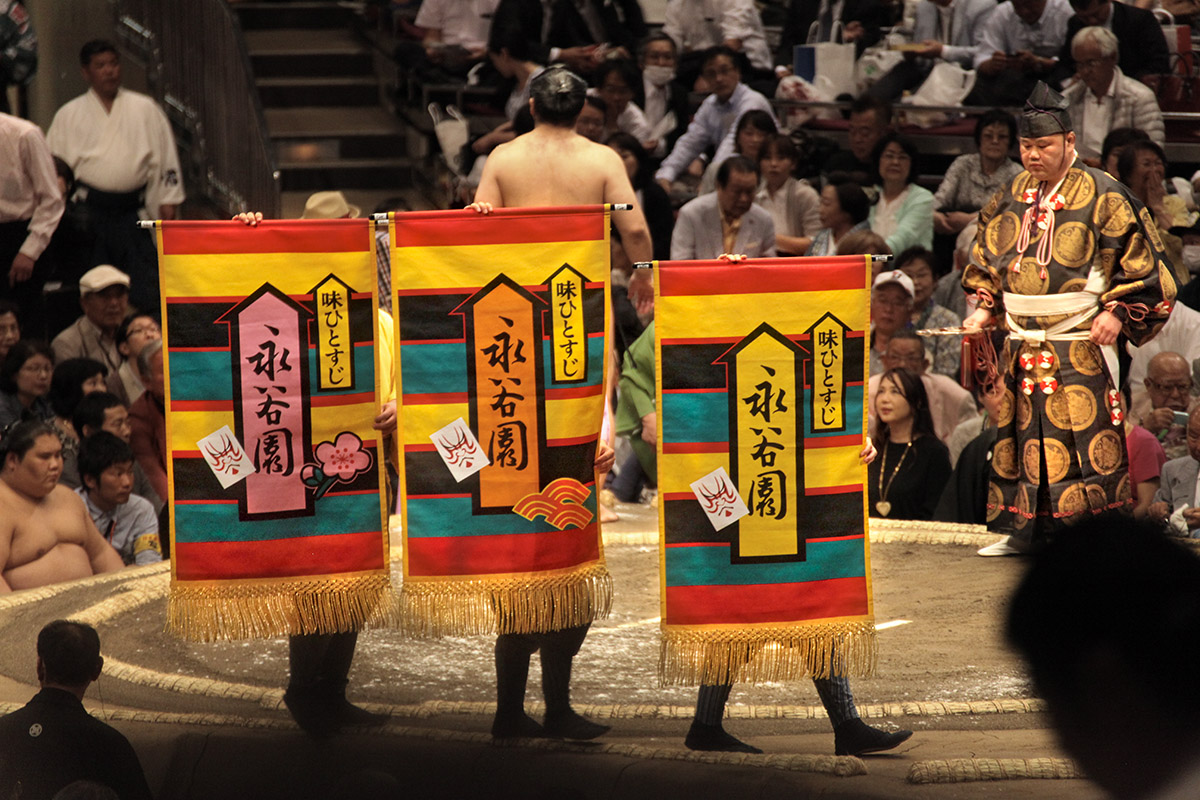 Sponsors’ banners. Towards the end of the day, the higher ranked sumotori get ads in the form of these banners before their match. Each banner is ¥70,000 which is $644 at today’s rate. The heya (stable) takes half and the Sumo Association takes ¥5,000 leaving the sumotori with ¥30,000 or $276 for each banner.