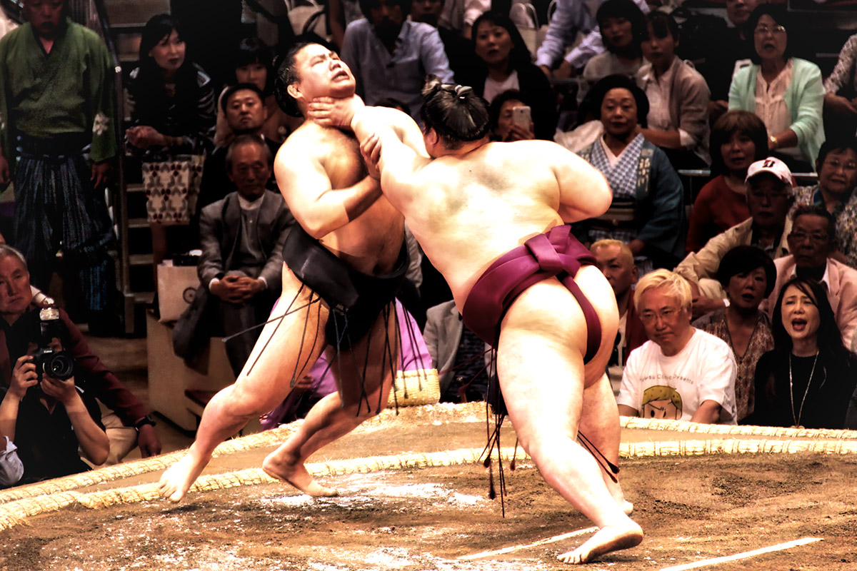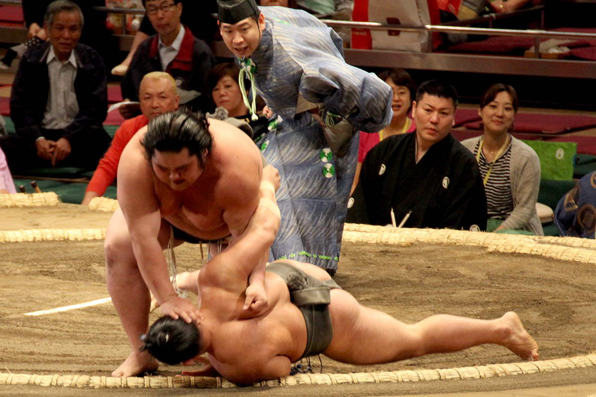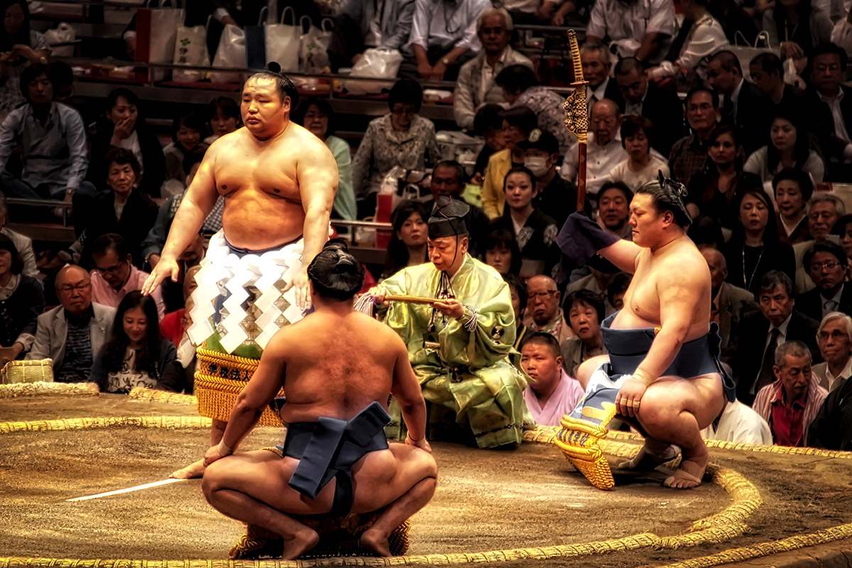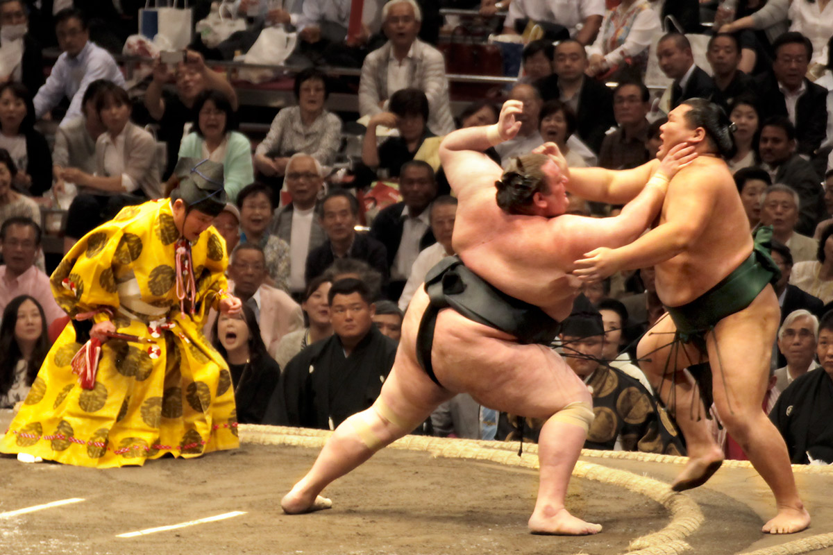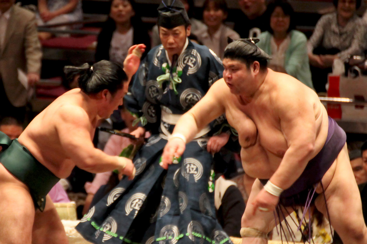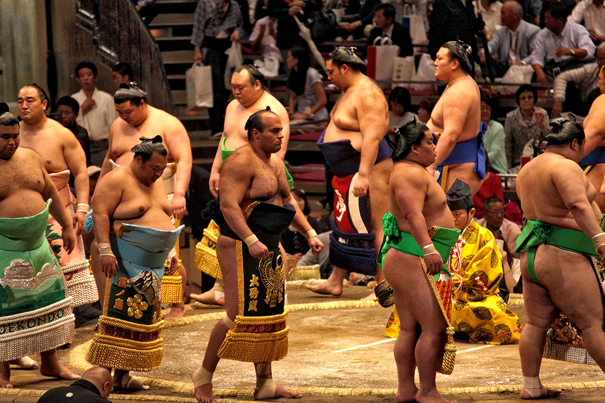 Sponsors’ banners. Towards the end of the day, the higher ranked sumotori get ads in the form of these banners before their match. Each banner is ¥70,000 which is $644 at today’s rate. The heya (stable) takes half and the Sumo Association takes ¥5,000 leaving the sumotori with ¥30,000 or $276 for each banner.