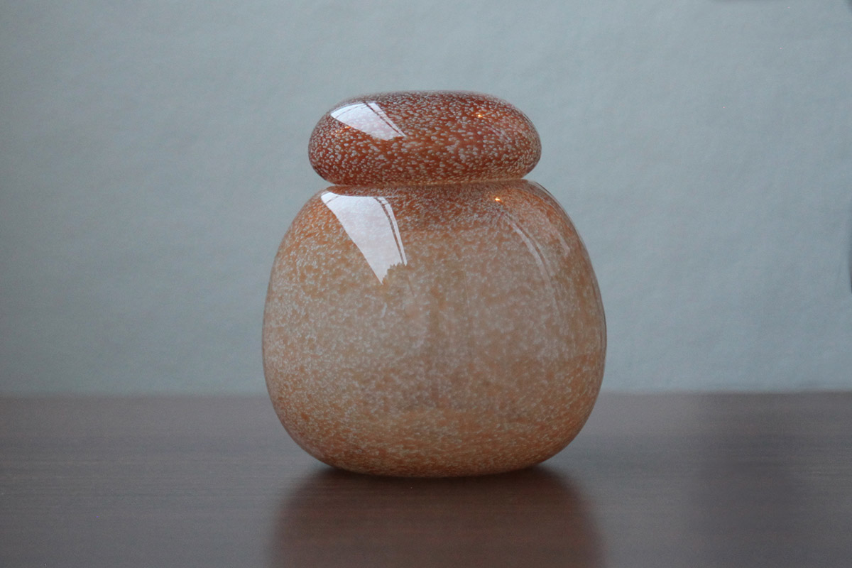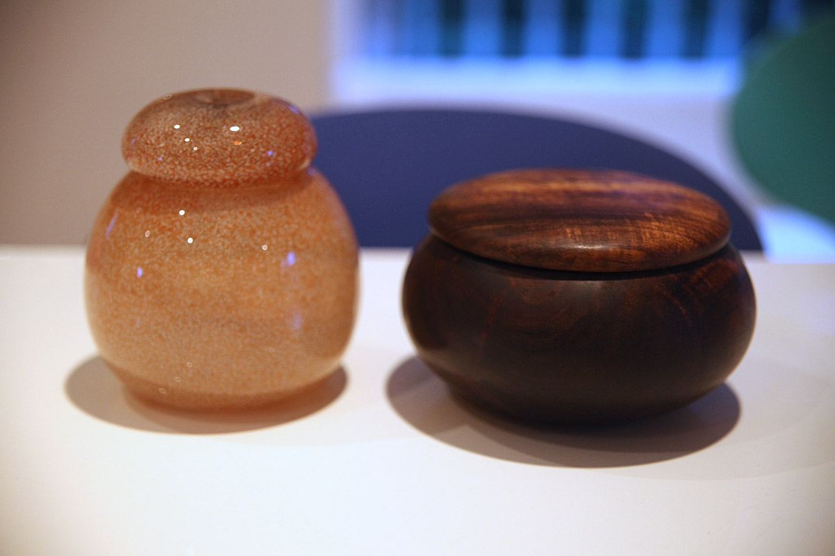 Traditional Hawaiian poi pounders and containers executed in glass.