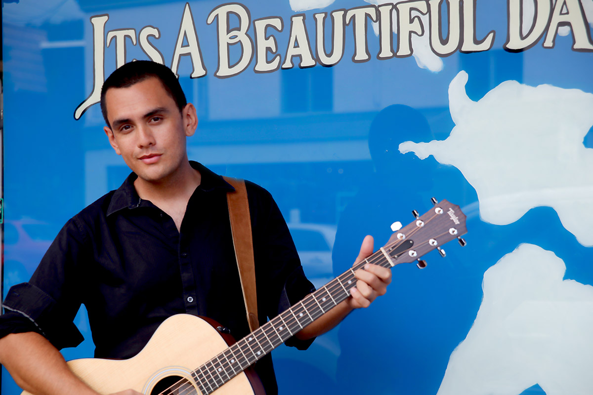 Aaron Boothe in Historic Wailuku Town. Son of Pekelo Cosmos, Aaron plays a mean guitar and sings a pretty but gritty song.