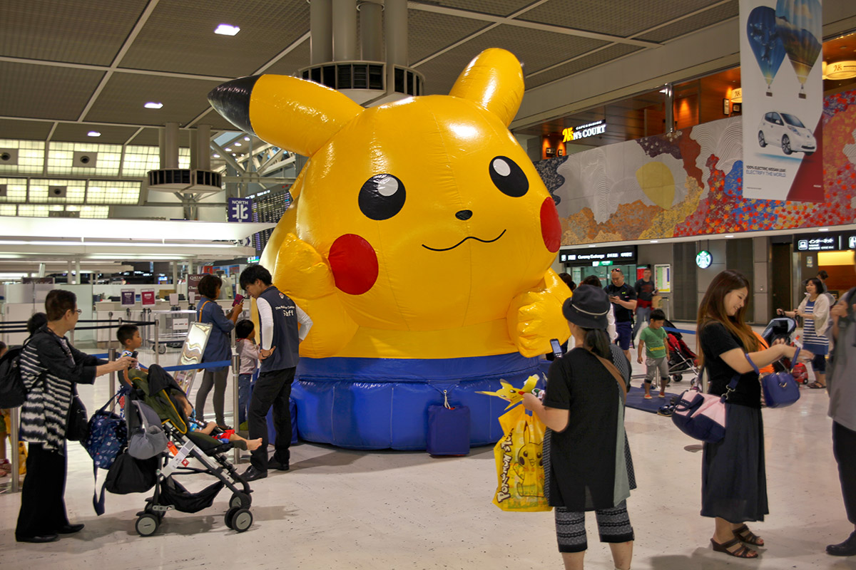 Pikachu is everywhere, these days. While the children bounce inside Pikachu’s inflatable body, adults play Pokemon Go at Narita.