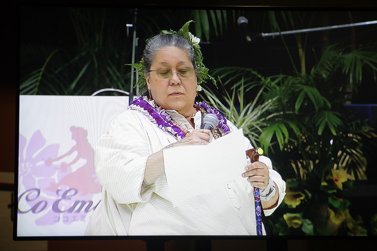The judges from left: Kehaulani Kekua from Kauaʻi, Chinky Mahoe from O’ahu, Hōkūlani Holt from Maui. Hōkūlani Holt also served as Executive Director for this competition.