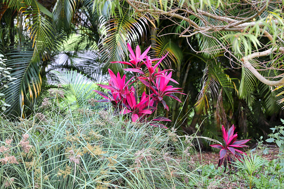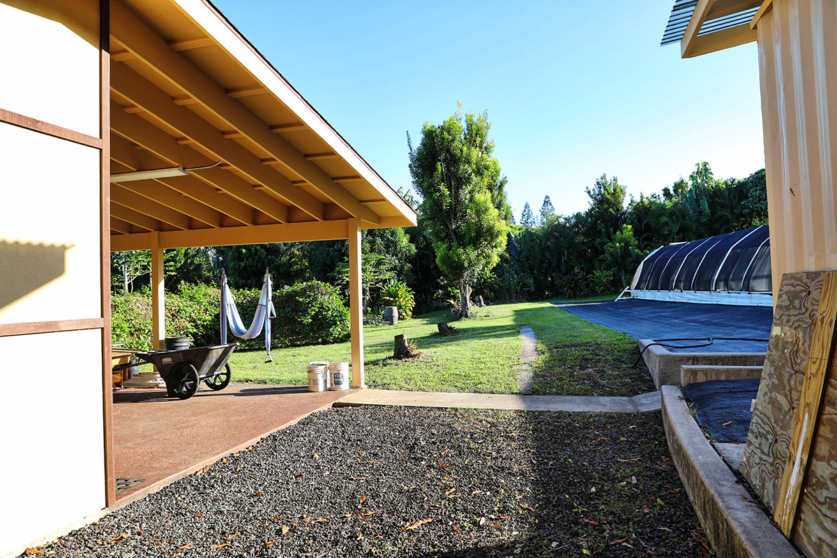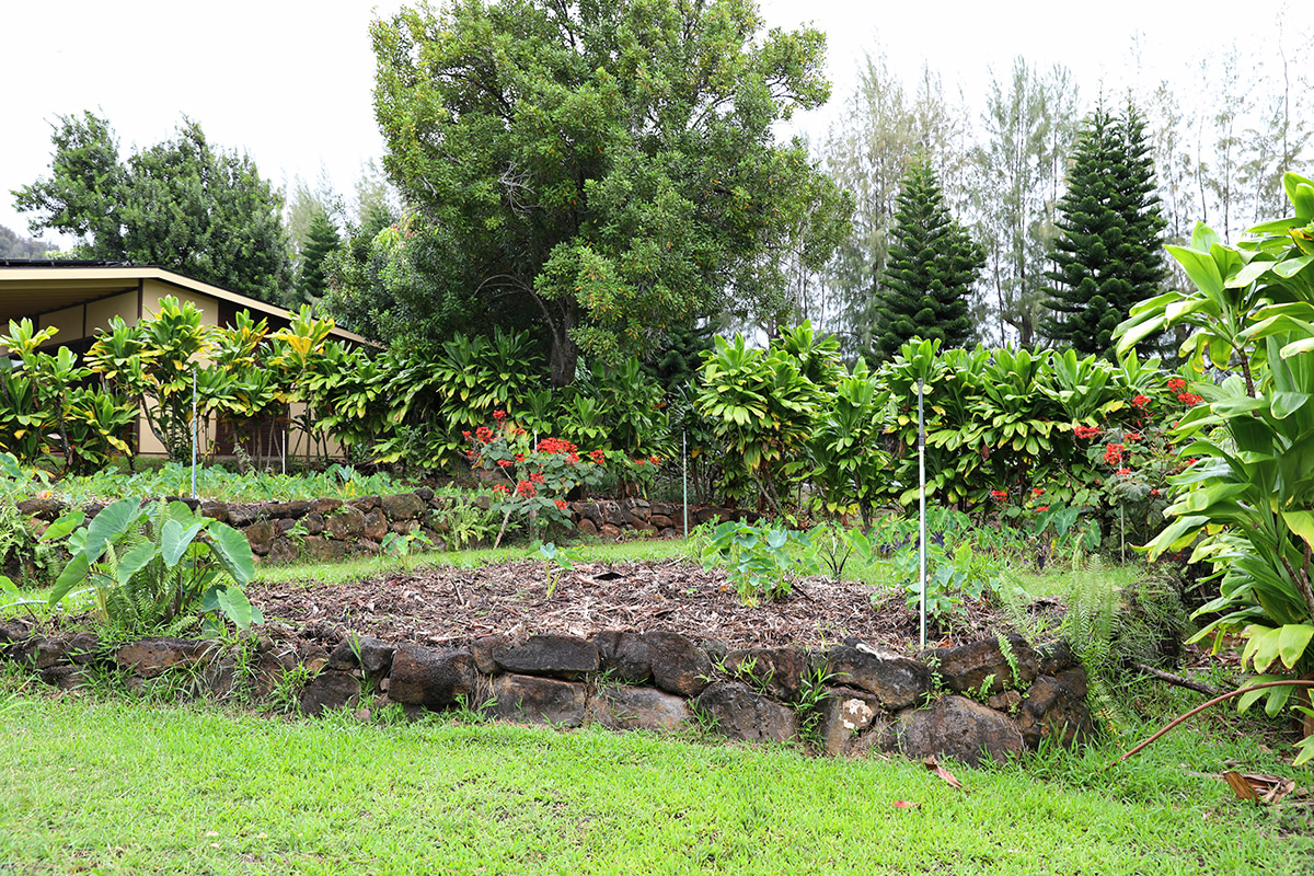 The cardboard covers the grass/weeds and then the woodchips covers the cardboard, smothering everything underneath and adding nitrogen to the soil. This land was first taro with the Hawaiian, then sugar cane, pineapple, and macadamia nut, seriously depleting the soil because of Western cultivation practices.