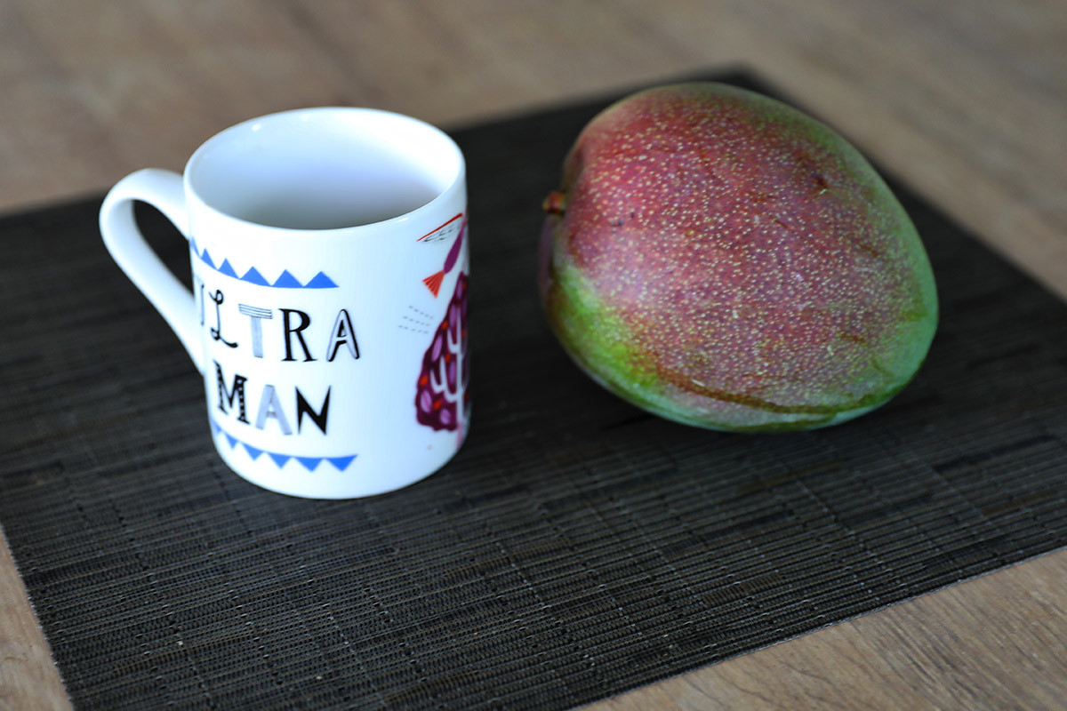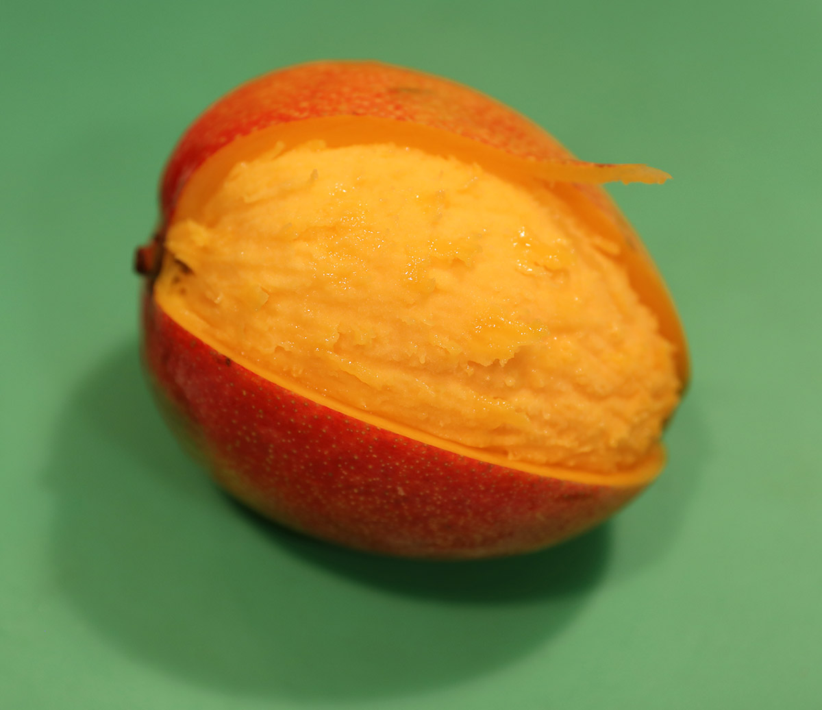 The first two mangoes on the land, this is the bigger of the two. May have picked it too early out of anxiety — sometimes you see a perfectly ripe fruit and then when you pick it, you see that a bird has poked a hole in it. Waited ten days before eating it.