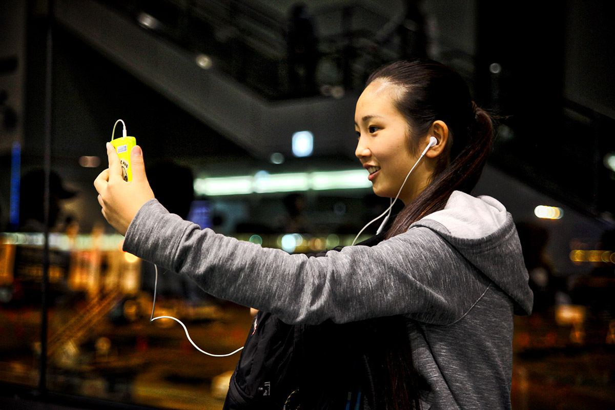 Haruno facetimes and takes selfies at Narita Airport.