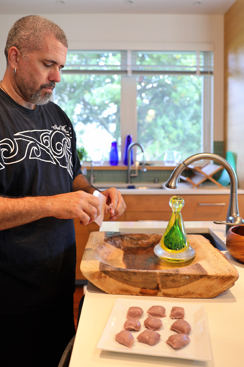 Paul K. Robinson pounds out some pa’i ‘ai on Kahu Bula Logan’s papa and Malcolm Wong’s ku’i ‘ai aniani. It was a smooth, mochi-like result!