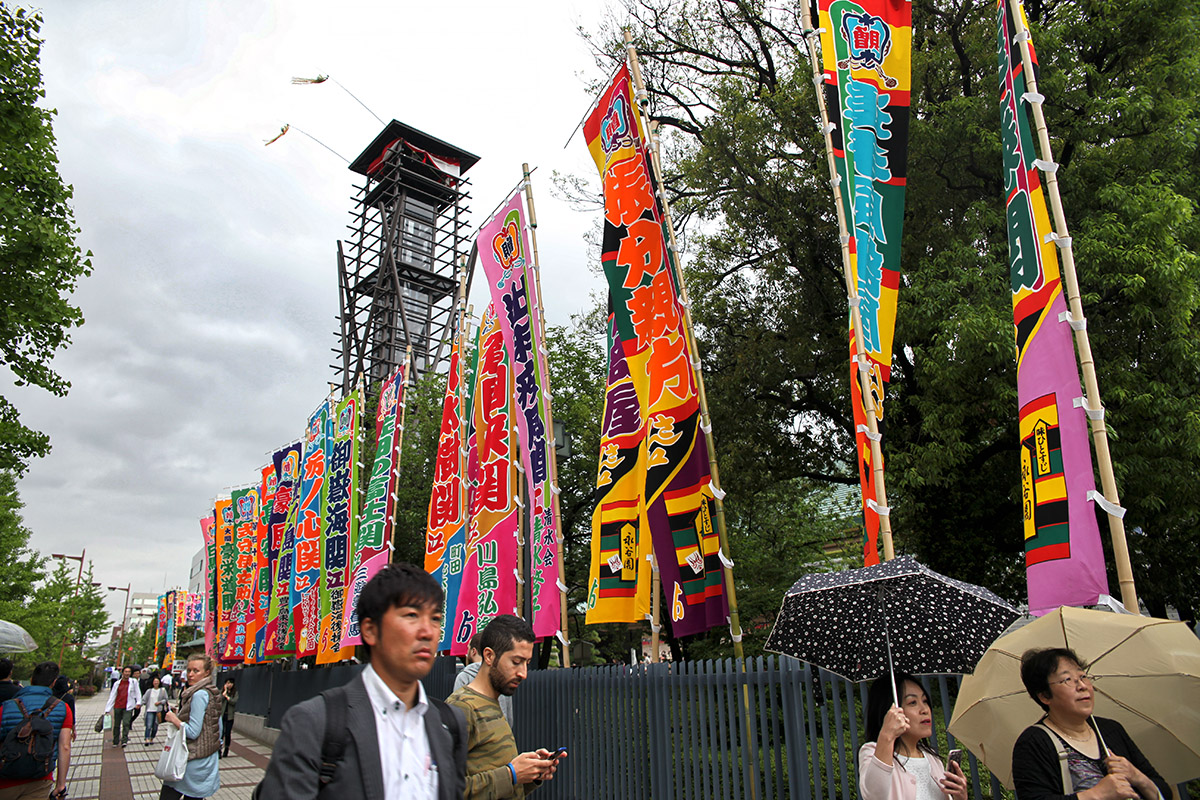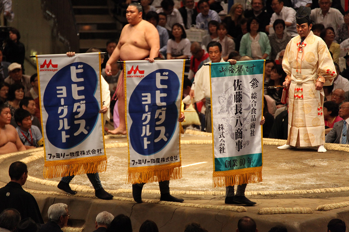 Sponsors’ banners. Towards the end of the day, the higher ranked sumotori get ads in the form of these banners before their match. Each banner is ¥70,000 which is $644 at today’s rate. The heya (stable) takes half and the Sumo Association takes ¥5,000 leaving the sumotori with ¥30,000 or $276 for each banner.